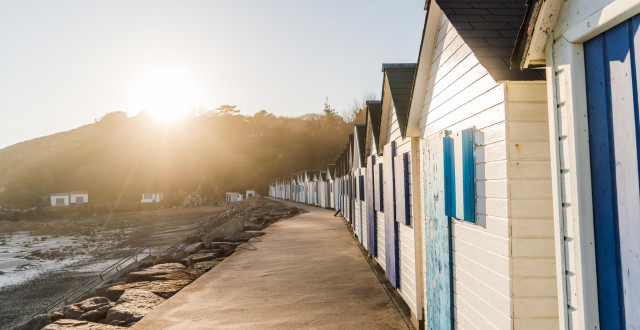 À Barneville-Carteret, la plage incarne tous nos rêves. C’est d’abord le lieu des vacances, des longues plages blondes bordées par les dunes d’un côté et de l’autre par la vie balnéaire, ses restaurants de fruits de mer et ses cafés de marins. C’est aussi le lieu de l’élégance. Depuis le XIXe siècle et la mode des bains de mer, les hôtels et les authentiques villas normandes ont fleuri le long de la station et sur les hauteurs. La plage dite de la Potinière est même aujourd’hui encore bordée par une enfilade de pittoresques cabines de bain, blanches et bleues qui nous happent vers l’insouciance.